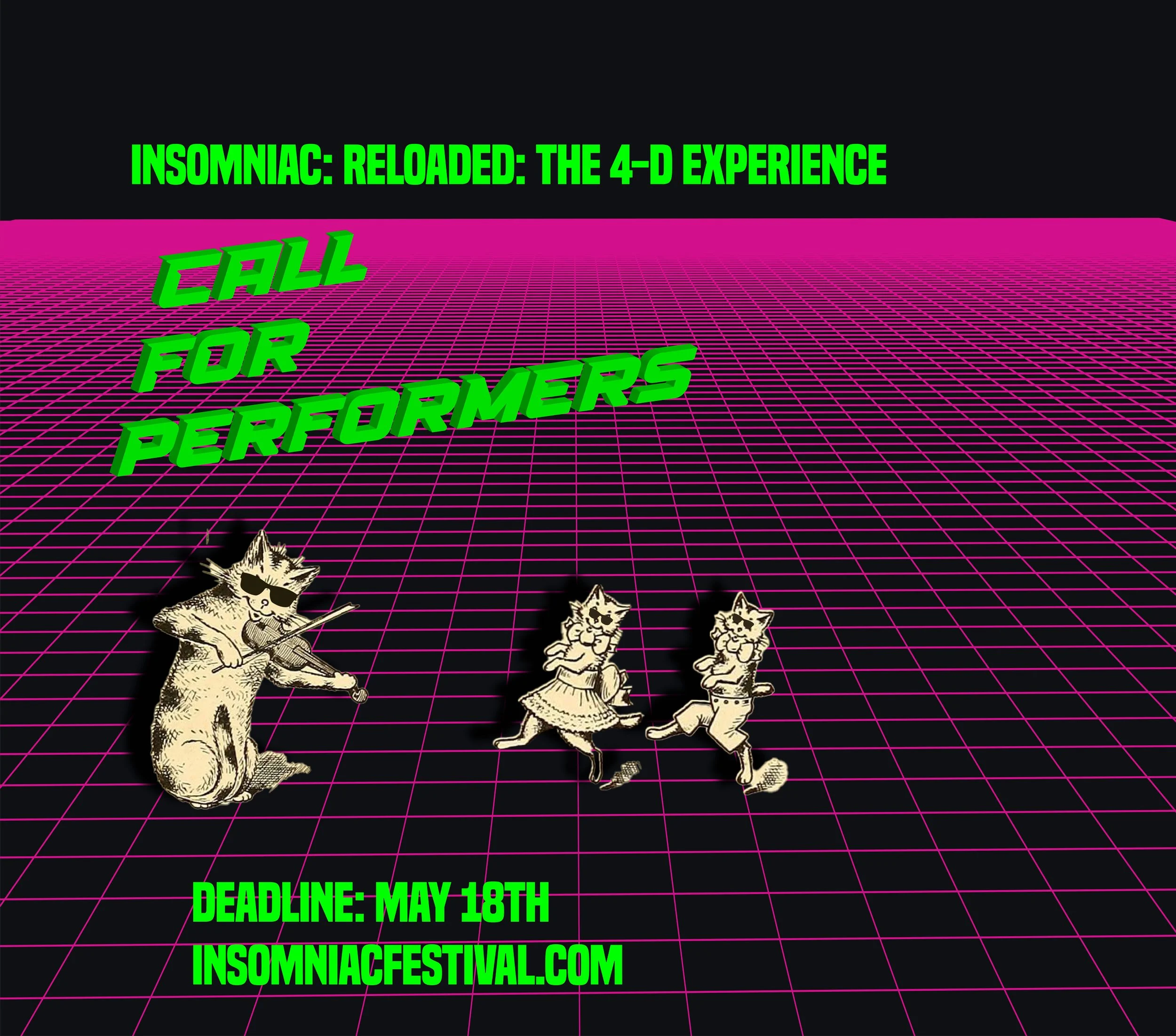 This year’s festival will showcase a curated selection of films alongside LIVE PERFORMANCE PIECES. It will be a multi-dimensional, multi-media, multi-multiple experience. Films will burst out of the screen, interacting with performers and audiences in a way unlike any Insomniac that has come before! And now… WE’RE LOOKING FOR PERFORMERS!!!